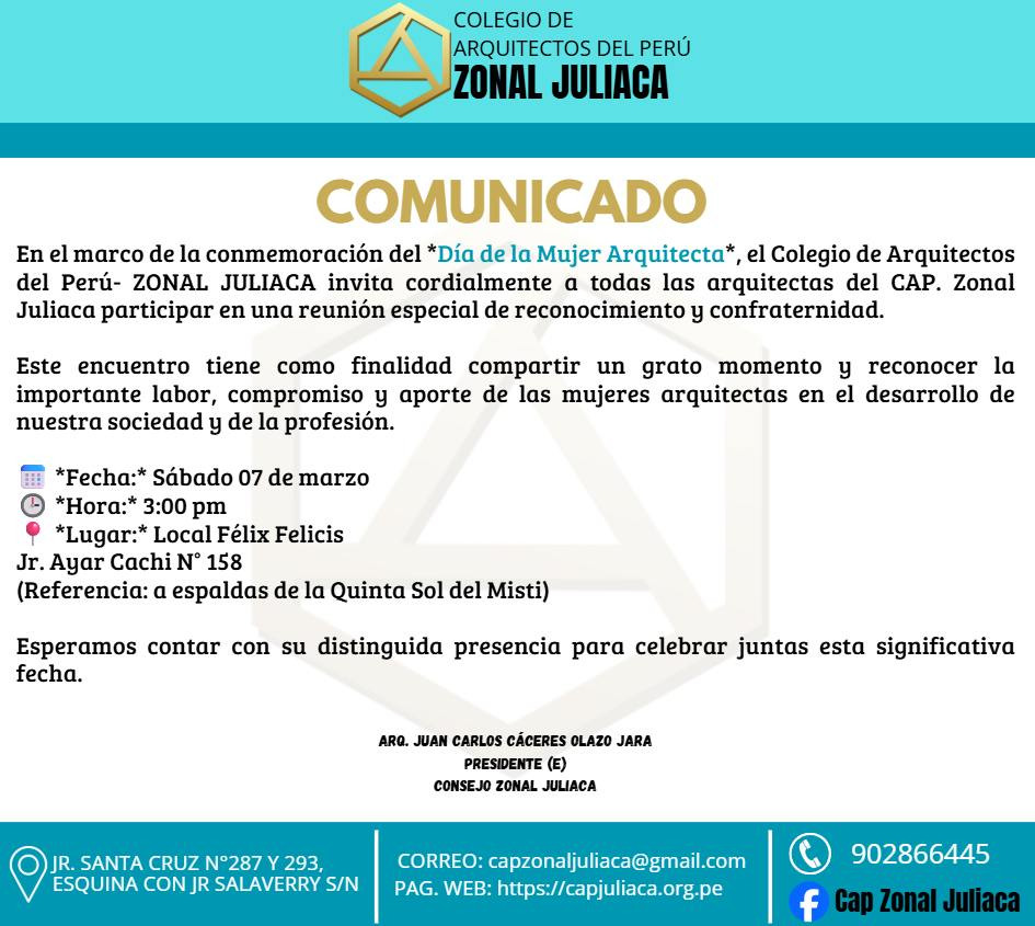 En conmemoración del Día de la Mujer Arquitecta, el Colegio de Arquitectos del Perú – Zonal Juliaca invita cordialmente a todas las arquitectas agremiadas de nuestra zonal a participar en una reunión especial de reconocimiento y confraternidad. 5 de marzo de 20260